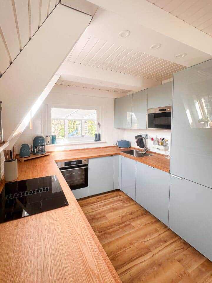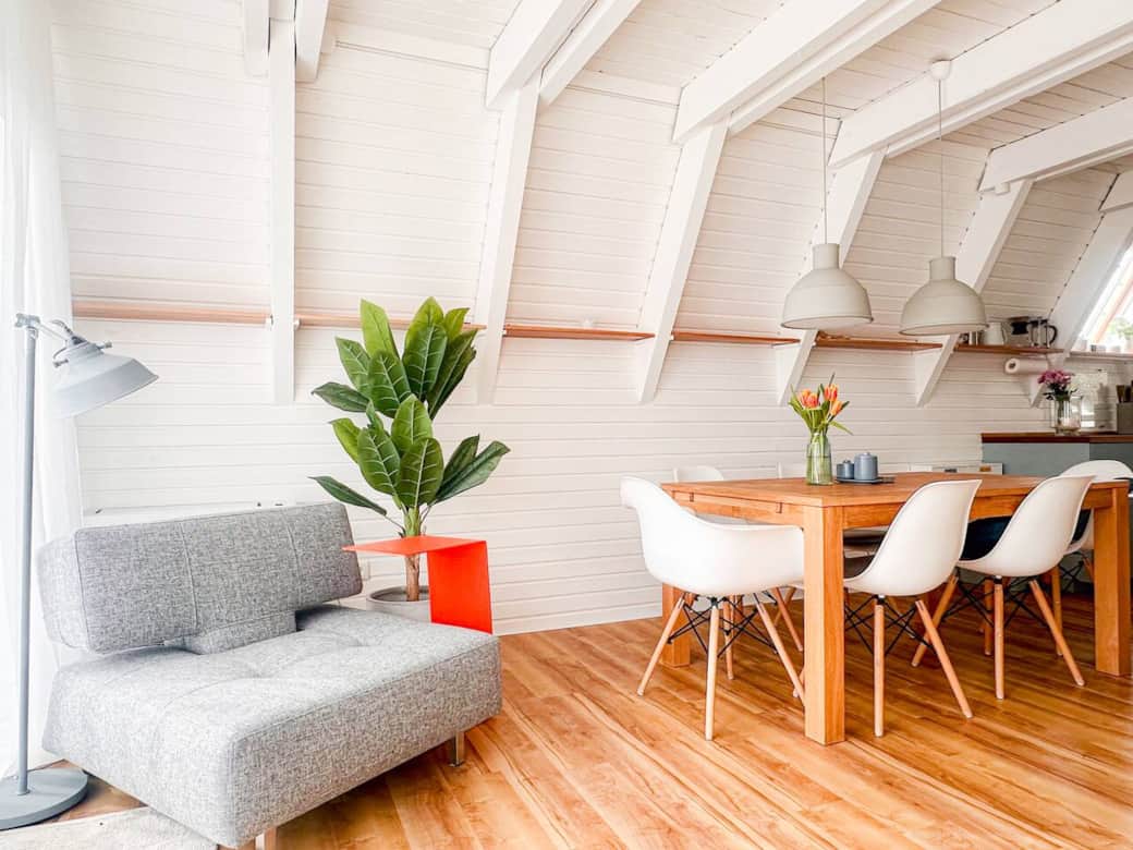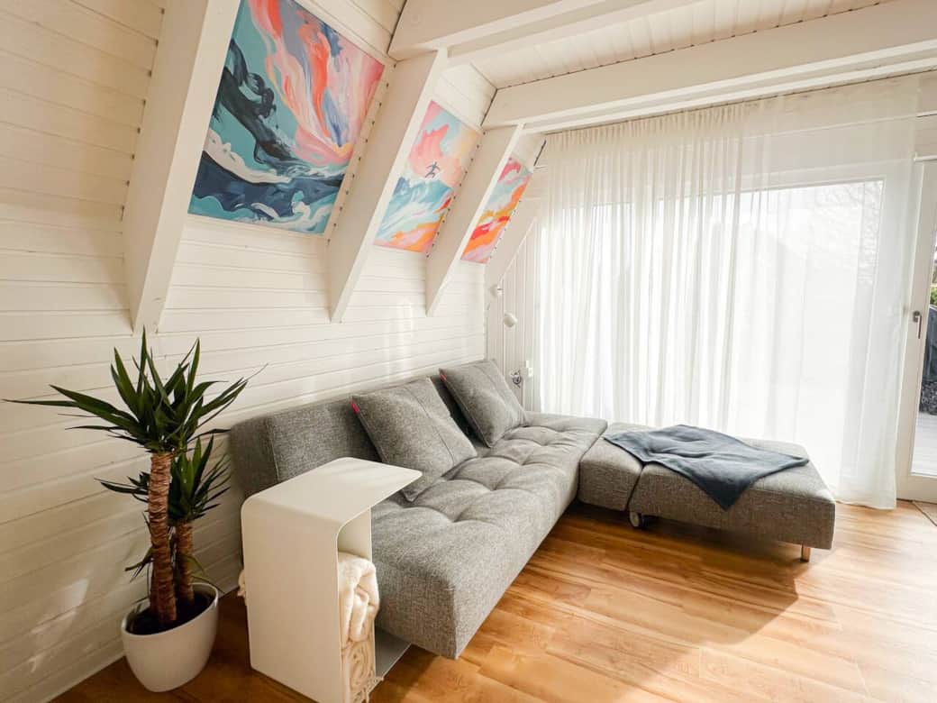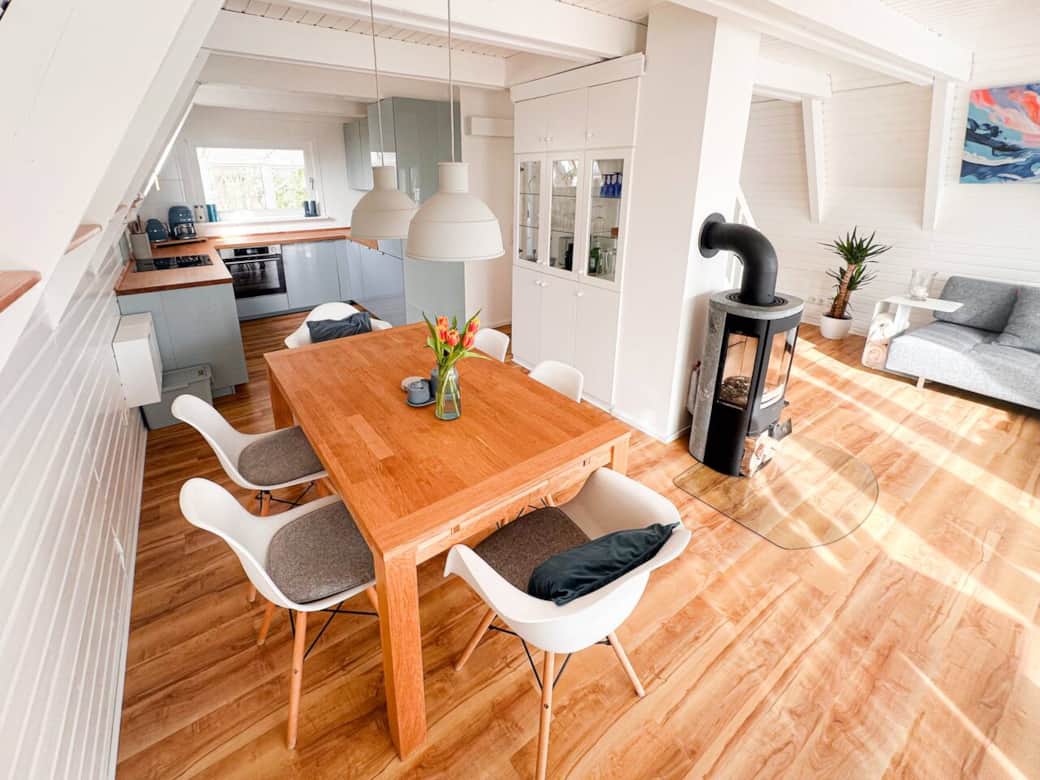 Stilvolles Nurdach-Holzhaus (2026 komplett renoviert) in ruhiger Lage, 200 m vom Strand entfernt. Helle 90 qm mit offenem Wohn-/Essbereich, Kamin, moderner, voll ausgestatteter Küche & Smart-TV. Wintergarten sowie zwei sonnige Terrassen laden zum Entspannen ein. Großer Garten mit Spielbereich für Kinder. 2 Schlafzimmer, Bad mit Fußbodenheizung & Gäste-WC. Klimaanlage, Glasfaser-WLAN, Fahrräder, Fitness-Equipment & 3 Parkplätze inklusive. Einkaufsmöglichkeiten & Restaurants gut erreichbar.